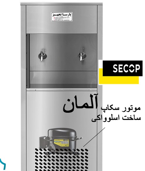 آبسردکن استیل دو شیر 2BS ،ظرفیت خنک کردن 90 لیتر آب در ساعت، ترموستات دانفوس، کمپرسور 1.4 اسب سکاپ آلمان ساخت اسلوواکی، حجم مخزن 30 لیتر ، جنس بدنه 0/7 دهم، مخزن استیل ضد زنگ ضخامت 1 ضد زنگ 304 نگیر با جوش آرگون ، دو عدد شیر استیل، لوله کشی مس، ابعاد140 × 50 × 50، وزن 45 کیلوگرم-کندانسور ۱/۳-گاز 134 مخصوص آبسردکن- 14 ماه گارانتی